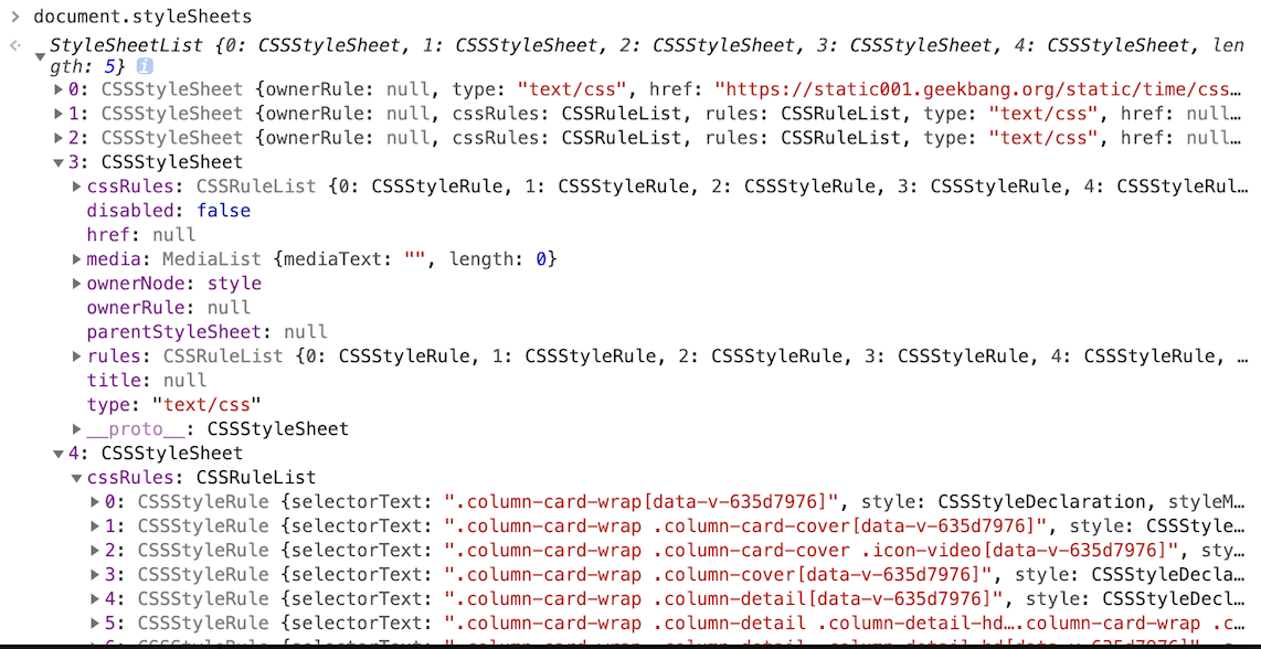 CSS 规则的来源一共三种:CSS 文件外联、 Style 标签、行内样式。外联的 CSS 文件是当下载完成后就开始解析,并解析成 styleSheets。我们可以在浏览器中看到它的结构,在控制台输入document.styleSheets: