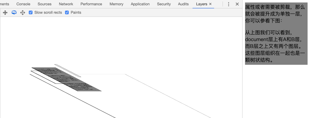 <style> div { width: 200; height: 200; overflow:auto; **background: gray;** } </style> <body> <div > <p>所以元素有了层叠上下文的属性或者需要被剪裁,那么就会被提升成为单独一层,你可以参看下图:</p> <p>从上图我们可以看到,document层上有A和B层,而B层之上又有两个图层。这些图层组织在一起也是一颗树状结构。</p> <p>图层树是基于布局树来创建的,为了找出哪些元素需要在哪些层中,渲染引擎会遍历布局树来创建层树(Update LayerTree)。</p> </div> </body>出现这种裁剪情况的时候,渲染引擎会为文字部分单独创建一个层,如果出现滚动条,滚动条也会被提升为单独的层。