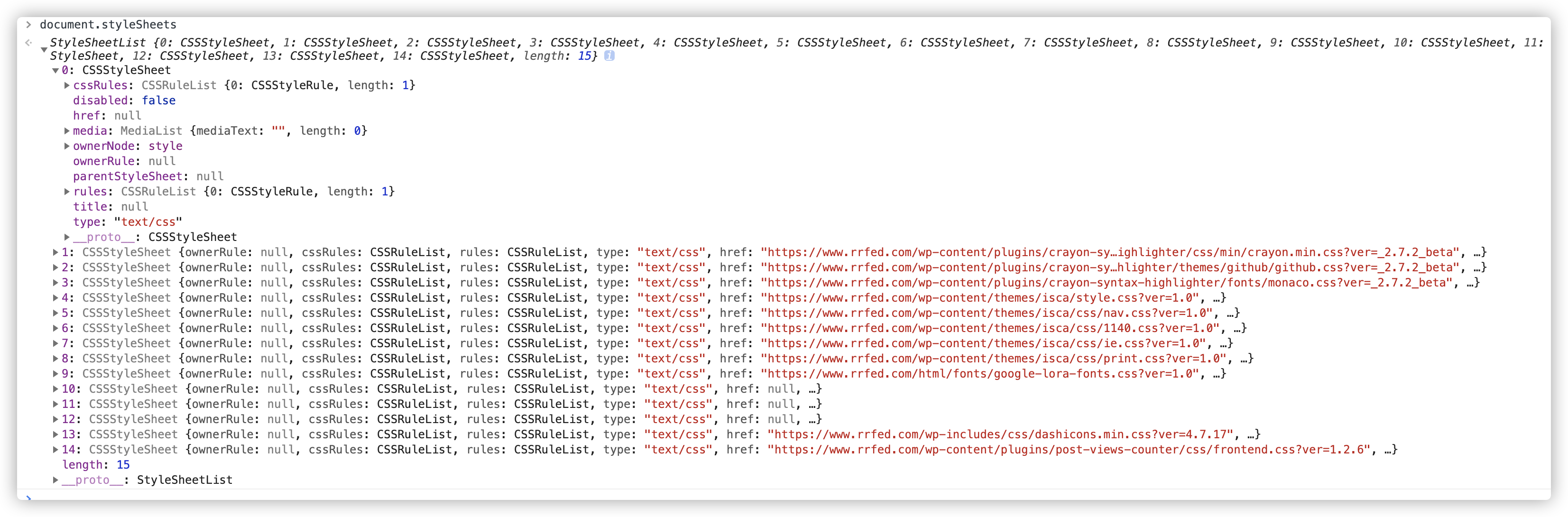 收集完 CSS 规则后,会解析 CSS 。具体过程还是先进行词法分析,生成 Token。和 HTML 解析不同的是,CSS 词法分析后,还需要进行语法分析。解析后会生成相应的规则对象,并push到规则数组中。对象的内容可以通过 document.styleSheets 查看。